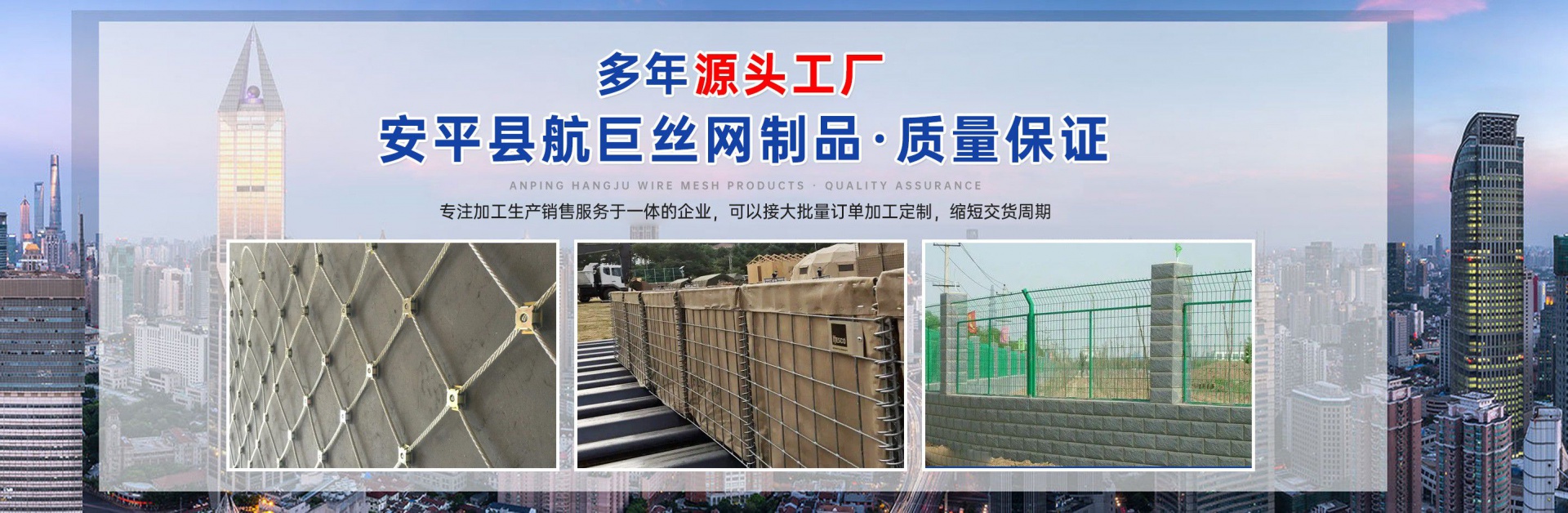 安平縣航巨絲網(wǎng)制品有限公司位于富有“絲網(wǎng)之鄉(xiāng)”美譽(yù)的—河北安平縣,此地是世界上最大的絲網(wǎng)集散基地,是華北平原上一顆璀璨的明珠。地處京、津、石三大城市中間,交通便利,是一家集生產(chǎn),加工,銷(xiāo)售為一體的大型絲網(wǎng)廠家。本廠專業(yè)生產(chǎn)各種類(lèi)型的絲網(wǎng),類(lèi)型齊全,主要包括:格賓石籠網(wǎng),雷諾護(hù)墊,麥克排水墊,加筋麥克墊,市政護(hù)欄,防爆籠,主動(dòng)防護(hù)網(wǎng),被動(dòng)防護(hù)網(wǎng),電焊網(wǎng)片,鋼格柵板等產(chǎn)品,形成了針對(duì)邊坡支護(hù)、基坑支護(hù)、山體邊坡綠化、鐵路、高速、公路、江河、堤壩及海塘的防沖刷保護(hù)以及水庫(kù)、河流截流等不同行業(yè)、不同規(guī)模、不同應(yīng)用的絲網(wǎng)產(chǎn)品和針對(duì)性解決方案,是國(guó)內(nèi)最有影響力的絲網(wǎng)產(chǎn)品供應(yīng)商。技術(shù)指標(biāo)達(dá)到國(guó)家同類(lèi)產(chǎn)品標(biāo)準(zhǔn),可以接受較大的定單并保證質(zhì)量和生產(chǎn)期限。 公司始終堅(jiān)持誠(chéng)信為本、質(zhì)量第一、客戶至上的經(jīng)營(yíng)理念,本著互惠互利的精神,希望與國(guó)內(nèi)外朋友共同合作,為您提供優(yōu)質(zhì)的產(chǎn)品和服務(wù)。我公司在創(chuàng)新管理中求發(fā)展、創(chuàng)新經(jīng)營(yíng)中求生存。把企業(yè)標(biāo)準(zhǔn)化管理、定額管理、計(jì)劃管理,公司十分注重把握市場(chǎng)經(jīng)濟(jì)的信息脈絡(luò),用現(xiàn)代網(wǎng)絡(luò)技術(shù),以科研開(kāi)發(fā)為原動(dòng)力,與科技院校及相關(guān)專家密切合作,共同研制開(kāi)發(fā)21世紀(jì)適用顧客需求的相關(guān)產(chǎn)品。 安平縣航巨絲網(wǎng)制品一直是以“質(zhì)量精良,交貨及時(shí),價(jià)格合理,服務(wù)周到”的宗旨來(lái)為廣大客戶服務(wù);并且本著“質(zhì)...